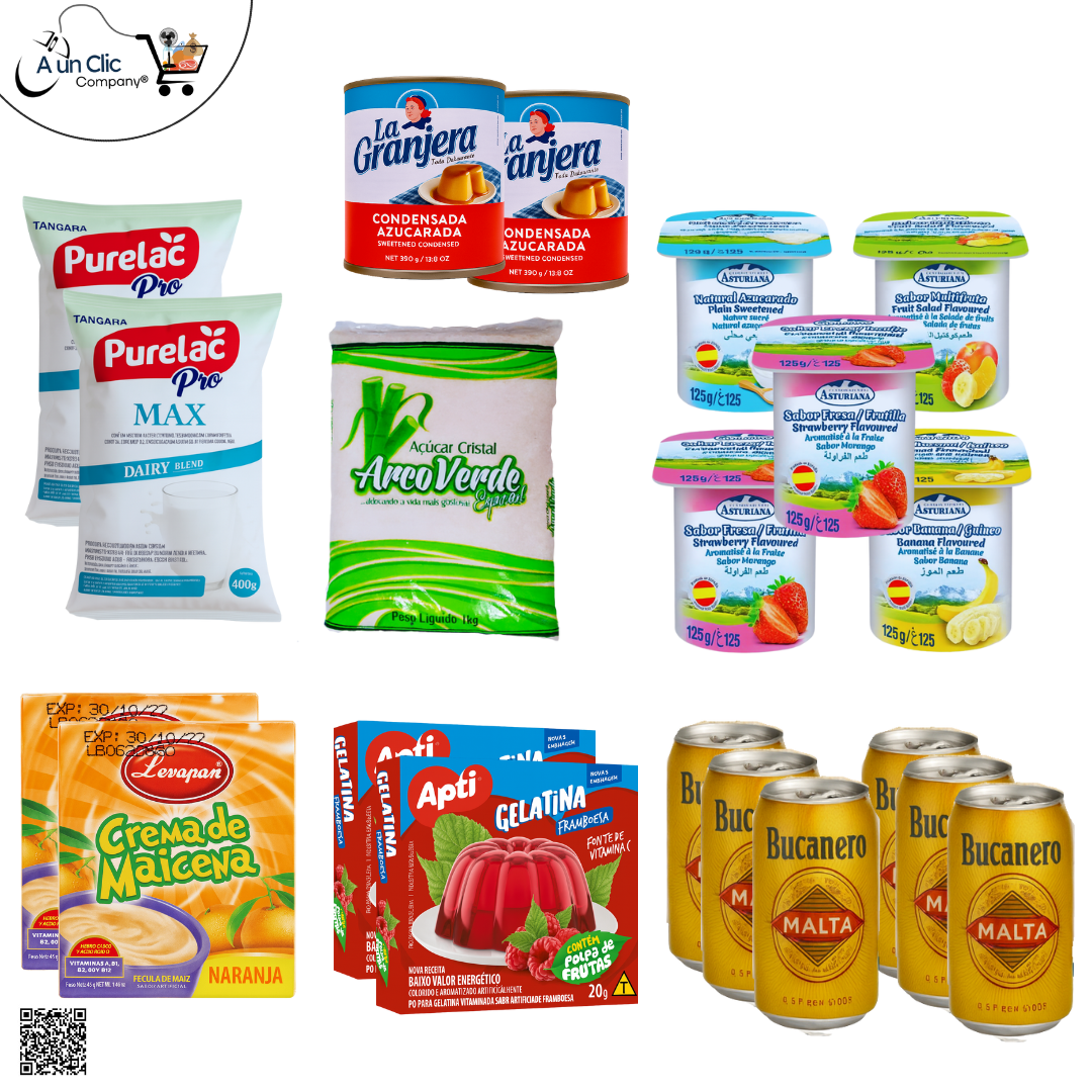 El Combo #2 reúne la dulzura y frescura que no pueden faltar en tu hogar. Incluye leche condensada y leche en polvo, perfectas para endulzar y enriquecer tus recetas; azúcar blanca de calidad para darle el toque justo a cada preparación; gelatina y yogurt para postres ligeros y nutritivos; maicena versátil para repostería y cocina; y la inconfundible Malta Bucanero, que aporta ese sabor refrescante y único. Un combo pensado para consentir a tu familia con sabor, calidad y tradición en cada momento.