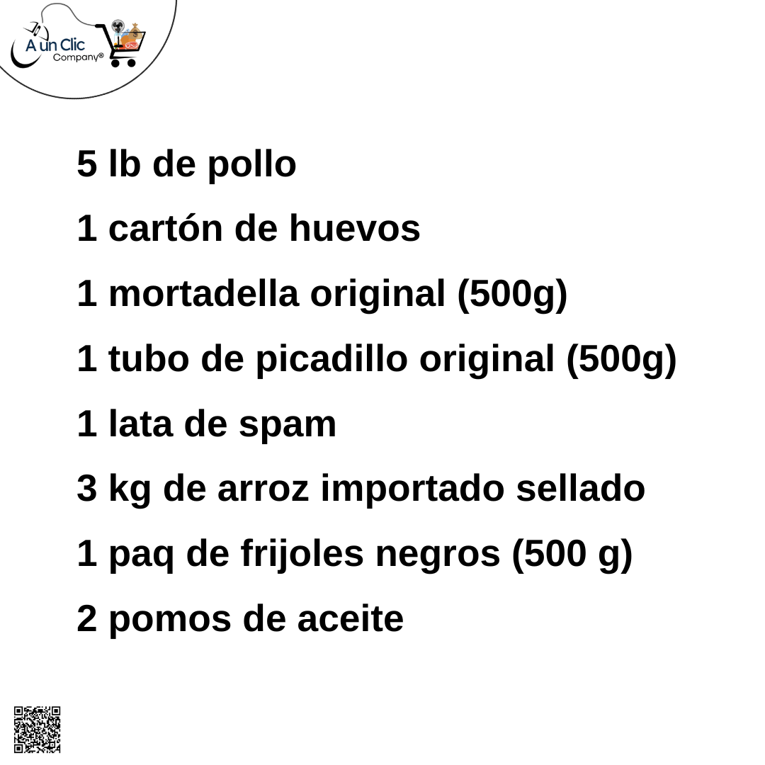 El Combo #4 está diseñado para llevar a tu mesa lo mejor de la canasta básica con un toque de variedad y practicidad. Contiene pollo y huevos frescos de gallina para preparar comidas nutritivas y versátiles, mortadela y picadillo que añaden opciones rápidas y llenas de sabor, además del clásico Spam para darle un giro diferente a tus recetas. Se completa con arroz blanco y frijoles negros, pilares de la cocina tradicional, y aceite vegetal indispensable en cada preparación. Un combo completo que une frescura, calidad y tradición en un solo paquete para el disfrute de toda la familia.