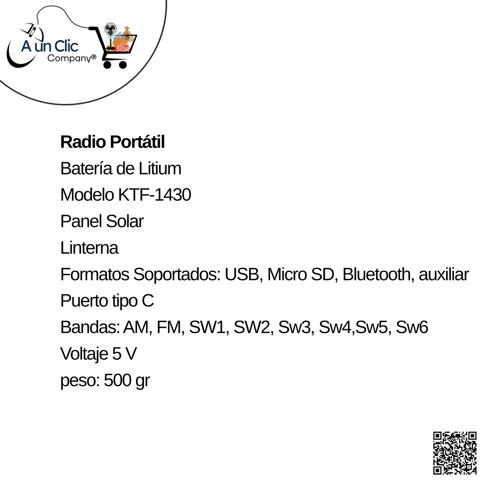 Disfruta de la mejor música y funcionalidad con el Radio Portátil KTF-1430, equipado con panel solar, linterna, conexión Bluetooth y reproductor USB. Un diseño práctico y versátil, ideal para acompañarte en casa, al aire libre o en tus viajes.